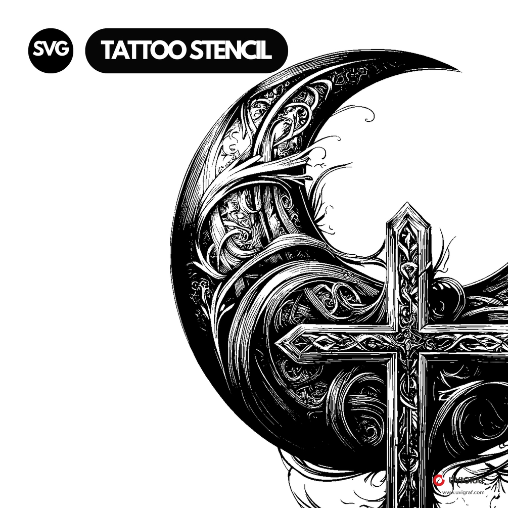 Moon & Cross Tattoo Design – Sacred Symbol Vector & Printable Stencil | ta3.24